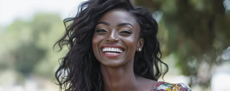 African American woman with a radiant smile outdoors: Portrait of joy. Concept Outdoor Photoshoot, African American Woman, Radiant Smile, Portrait, Joyful