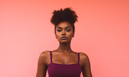 A young woman stands with poise showcasing her flawless skin and striking features. Her expression is calm and assertive complementing the simple backdrop that enhances her elegance.