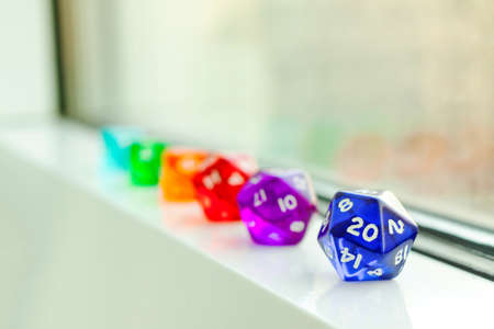 Dice for playing dnd, rpg, fantasy games. twenty-sided cube and polyhedral cubes on white background