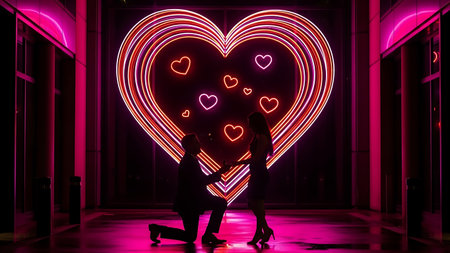 A couple enjoying a photography session in front of a sparkling heart-shaped light display for Valentine's Day.