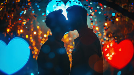 Gay couple kissing against the background of bokeh of hearts. Romantic night Love engagement concept. Generative AI.