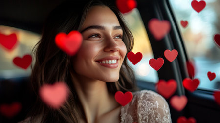 Beautiful Happy Woman Smiling Looking Out Car Window, 3D Hearts Around. Love, Romantic Date Concept