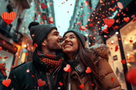 A joyful couple shares a tender moment, enveloped by floating hearts and confetti, capturing love and affection in a serene outdoor setting.