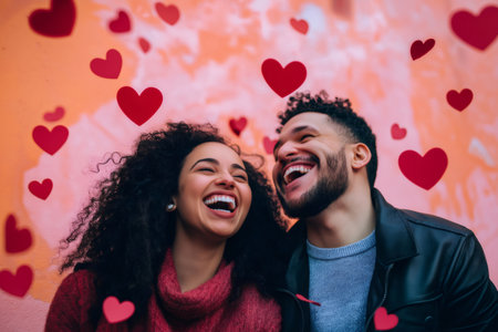 Young multi ethnic couple laughing together, celebrating Valentine's day with red hearts falling down on a pink background