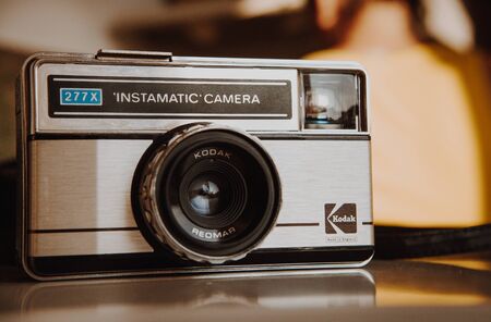Zilina, Slovakia - October 10, 2014: The Kodak Instamatic 277X a 126 cartridge film camera with Kodak Reomar lens stands on the glass table in Zilina, Slovakia