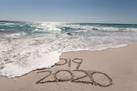 2019 and 2020 written in the sand on a sunny beach with calm sea and clear blue sky, the tide washing away the year 2019, new year and new years eve concept