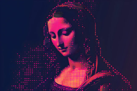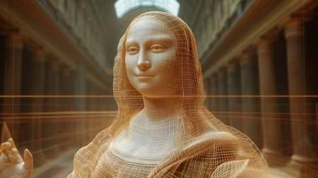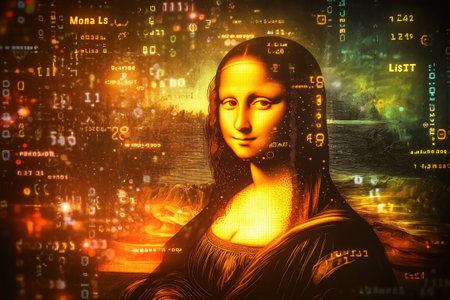 Holographic mona lisa with digital text and abstract shapes.