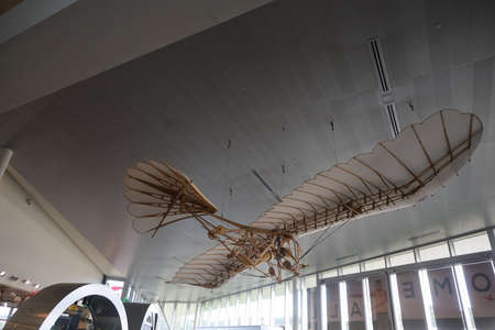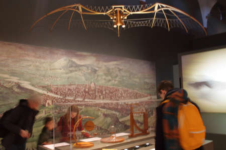 Museum of science, Milan - 2019: Tourists watching bird fly study reconstruction from Leonardo Da Vinci.