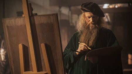 Medium Portrait of a Male Historical Figure Painting on Canvas in his Workshop. Famous Painter of the Renaissance Era Getting Inspired and Adding Details to his Masterpiece.