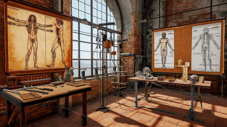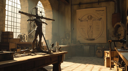 Transport yourself to Leonardo da Vinci's workshop a haven of creativity with intricate machinery anatomical sketches and unfinished paintings Bask in the soft natural light and immerse yourself in da Vinci's genius Discover the essence of innovation and artistic mastery