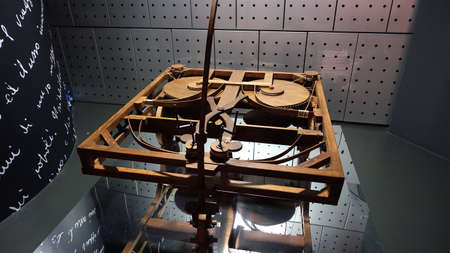 MILAN, ITALY - JUNE 9, 2016: wing-beating device with a screw and lead system models of Leonardo da Vinci's scientific studies displayed at the Science and Technology Museum Leonardo da Vinci