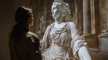 A sculpture of a famous historical figure is brought to life through augmented reality allowing viewers to see them in full motion and vivid color