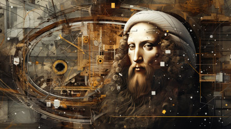 Portrait of a man with a beard on a background of an old mechanism. Leonardo Davinci style.