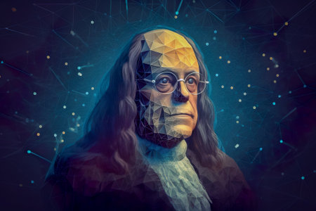 Artistic representation of a wise figure merging with a digital silhouette on a teal background