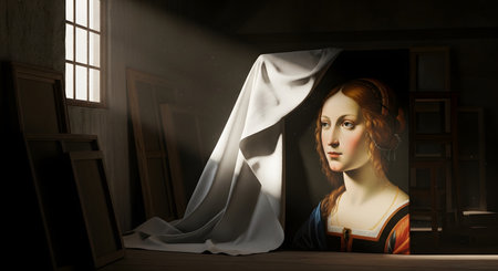 A dusty, dark art studio with frames and canvases is illuminated by a sunbeam from a window, revealing a beautiful, classical Renaissance-style painting of a woman. A white sheet is being pulled back from the painting. The image represents concepts of art, history, discovery, and the beauty of classic art.