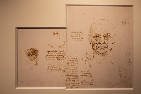 Turin, Italy - April, 2023: Leonardo da Vinci drawings on handmade cotton paper, Royal Library.