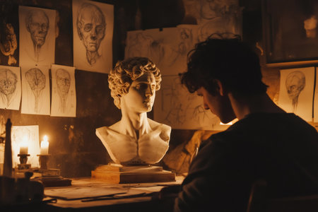 Young artist drawing in a candlelit studio with anatomical sketches and a renaissance inspired bust