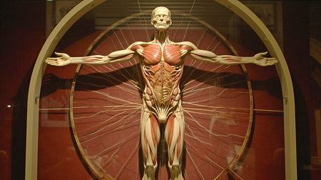 This image depicts a detailed anatomical diagram of the human body. The illustration shows the skeletal structure, muscles, and internal organs, all arranged within a circular frame. The figure stands with arms outstretched, emphasizing the symmetry and balance of the human form. This type of diagram is often used in medical studies and art to understand the intricate details of human anatomy.