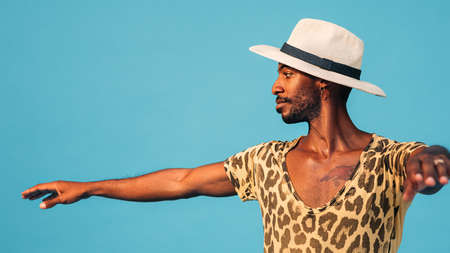 Side view of a young man wearing a straw hat dancing in studio against a blue background
