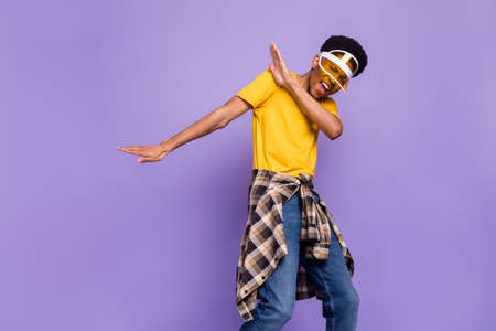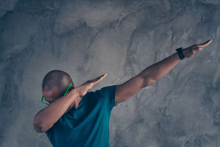 Close up photo amazing stunning he him his dark skin macho hot modern look trend motion hands arms raised strange dancing action clubber wear specs casual blue t-shirt isolated grey background