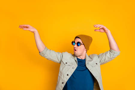 Portrait of modern guy dance disco floor raise hands look copyspace isolated over vivid color background