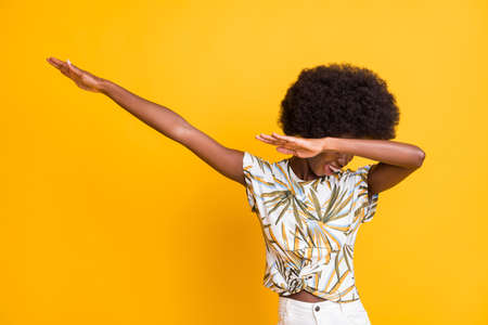 Photo of funky pretty lady show disco move dab wear print t-shirt isolated over vivid yellow color background