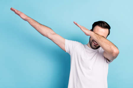 Young bearded man in casual blue shirt posing isolated on yellow orange wall background, studio portrait. People sincere emotions lifestyle concept. Mock up copy space. Showing DAB dance gesture.