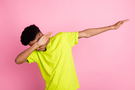 Photo of young african guy cover eyes dance performer dab pose hip-hope isolated over pink color background