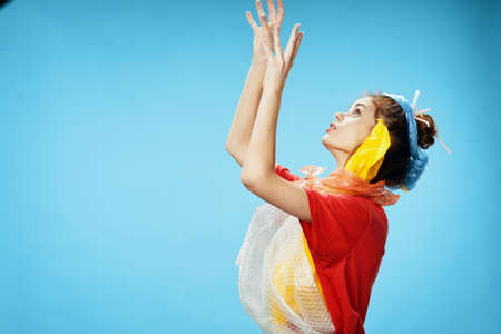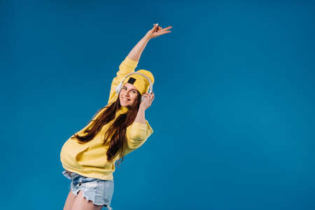 A pregnant girl in a yellow jacket and headphones stands on a blue background.