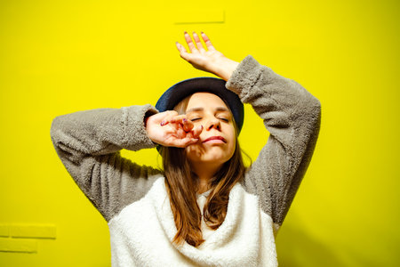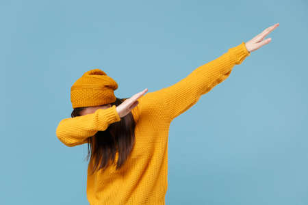 Young brunette woman girl in yellow sweater and hat posing isolated on blue wall background studio portrait. People sincere emotions lifestyle concept. Mock up copy space. Showing DAB dance gesture.