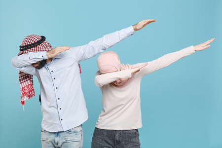 Young couple friends arabian muslim man wonam in keffiyeh kafiya ring igal agal hijab clothes isolated on blue wall background in studio.