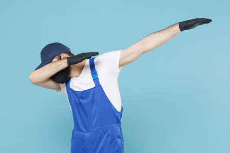 Delivery man in cap t-shirt coveralls uniform sterile face mask gloves isolated on blue background studio. Guy employee courier Service quarantine pandemic coronavirus virus covid-19 2019-ncov concept