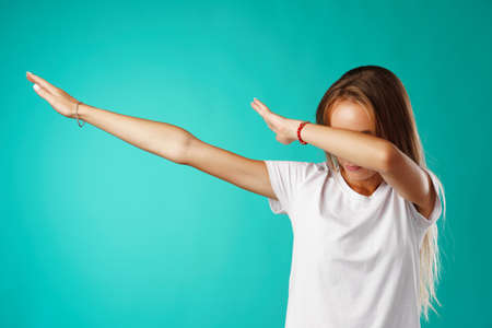 Young woman showing dab dance move close up