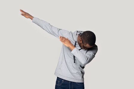 Happy young african american guy in sportswear performing show dance, making dab move gesture. Cheerful black millennial man presenting popular internet meme pose, isolated on grey studio background.