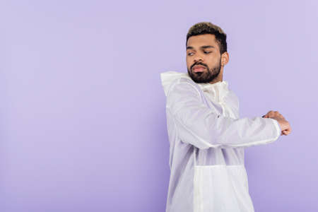 bearded african american sportsman in sportswear warming up isolated on purple