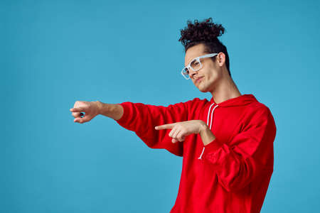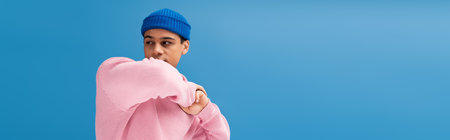 Millennial guy in pink sweatshirt and cap dabbing on blue background