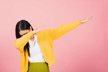 Asian happy portrait beautiful cute young woman teen smile standing move showing DAB dance against gesture raise hands arms covering face isolated, studio shot on pink background with copy space