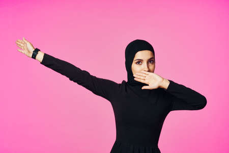 muslim woman in black hijab posing hand gesture model