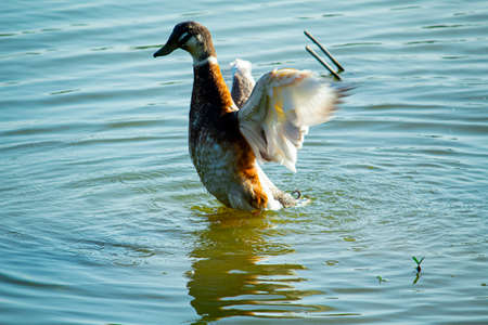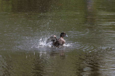 The duck bathes in a pond. Cleans feathers and does waves on water