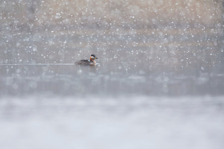 A red necked grebe (Podiceps grisegena) swimming in a lake in a snowstorm.