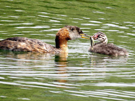 Red-necked grebe feeds its chick on the Lake Ontario in Humber Bay Park of Toronto, Canada, July 21, 2017