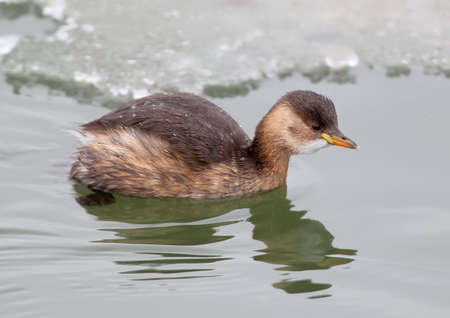 Very close up photo of a little grebe in winter plumage floats in a water with ice