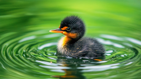 A small duckling floats on the surface of a calm pond surrounded by soft green hues, enjoying the warm sunlight. Its vibrant feathers are highlighted as it paddles gently, creating ripples.