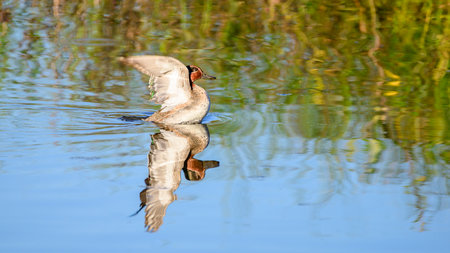Eurasian green-winged teal swimming in the calm waters of Lagoa Pequena in Sesimbra.