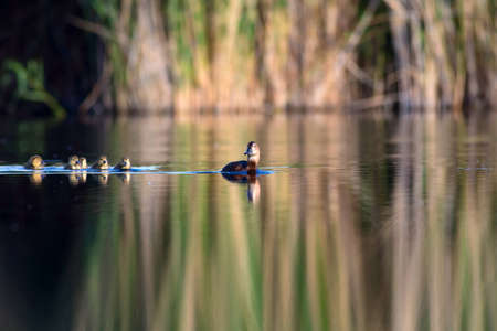 cute small water bird Little Grebe, Tachybaptus ruficollis, swimming on a river hunting for food.