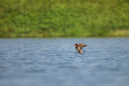 Red-necked grebe, Tachybaptus ruficollis, in flight.