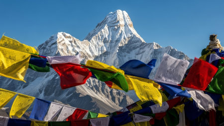 Prayer flags in front of snowy mountain.