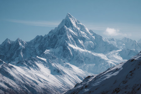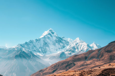 A view of a majestic snow covered mountain range under a clear blue sky, A majestic mountain range under a clear blue sky