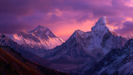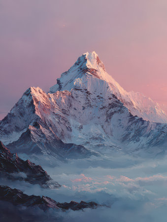 A breathtaking snow-capped peak rises majestically above ethereal clouds, bathed in beautiful pink twilight. Ideal for nature lovers and adventurers.