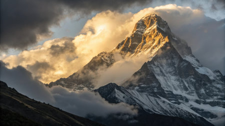 A breathtaking view of a snow-covered mountain peak bathed in the warm light of sunrise, with clouds partially obscuring the lower slopes. perfect for nature-themed designs, wall art, or desktop backgrounds, showcasing the serene beauty of mountainous landscapes. Generative AI